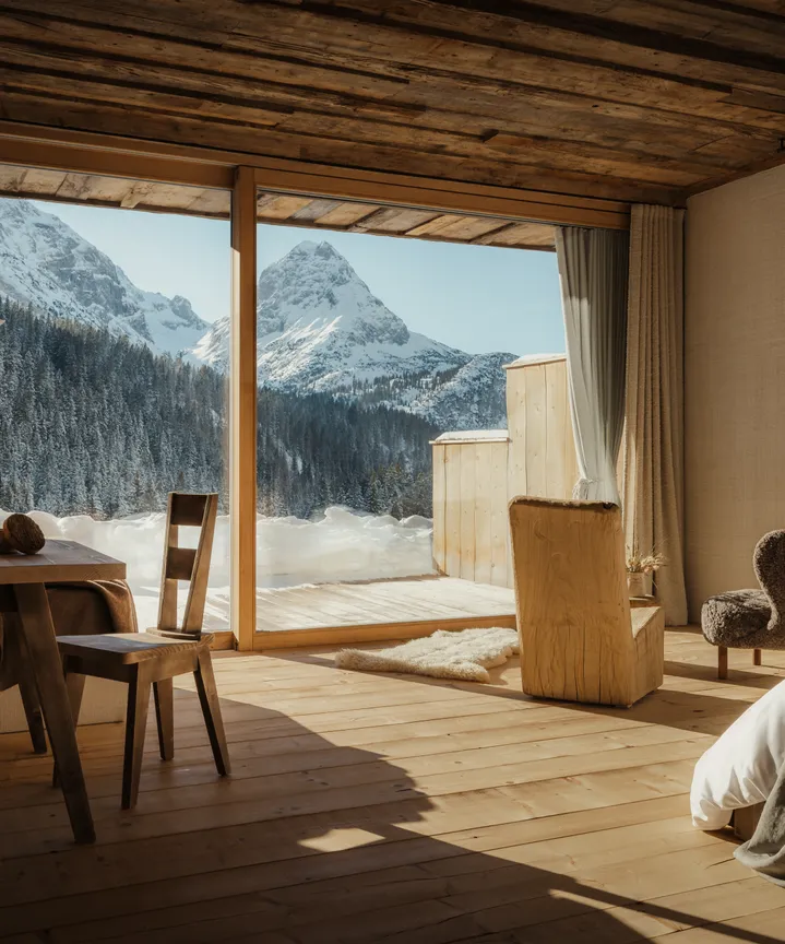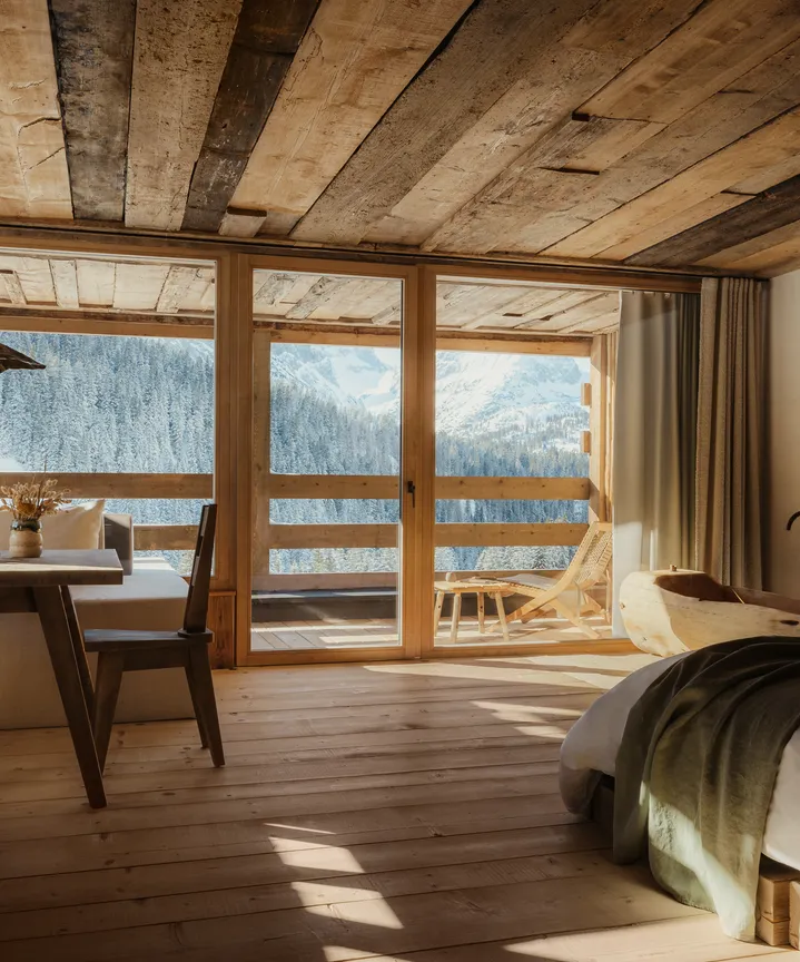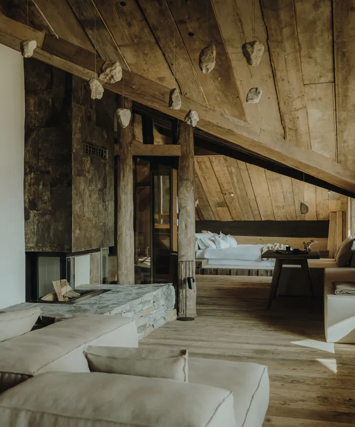 Stein, Holz aus den eigenen Wäldern und Naturstoffe aus dem Alpenraum prägen die 9 Suiten, die Gestaltung der Räume verbindet zeitlosen Luxus mit authentischem Alm-Erleben. Zurückhaltend in der Formgebung und gleichermaßen behaglich vermitteln die Suiten Halt und Hülle. Über bodentiefe Fenster dringt die Natur in den Raum und gestaltet in ihrer archaischen Vielfalt das Innere mit Licht- und Farbenspielen mit.