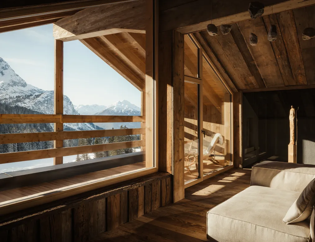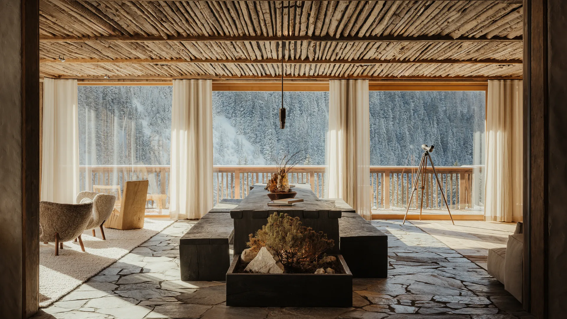 - Die Architektur orientiert sich am alpinen Stil. Natürliche, lokale Materialien gestalten das Außen und Innen: Stein und Holz, Schafwolle und Loden